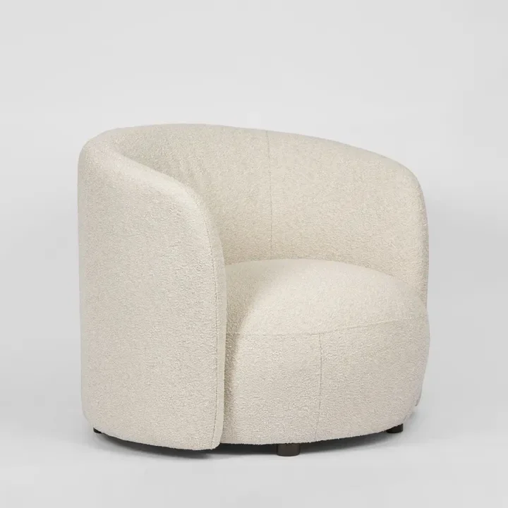 Bold yet inviting the petite Plume chair provides embracing comfort within a compact footprint. Its embracing circular shape features an embracing backrest that encases the dome like seat. Crafted with a sturdy frame and filled with high-density foam, this generously padded chair provides optimal support and comfort, making it ideal for that cosy corner. The Cleo Chairs available in a fresh Vanilla Boucle cover or the ever-popular Olive colour way that creates the perfect accent in contemporary interiors. Fabric is 100% polyester and is easy to clean. ADDITIONAL INFORMATION • Handcrafted with care using kiln-dried solid and engineered timber for added durability. • Generously padded with high-density foam with fibre overlay offering comfort and resilience. • The depth of seat is 66cm. • The overall height is 62cm. • The seat comfort is medium firmness.